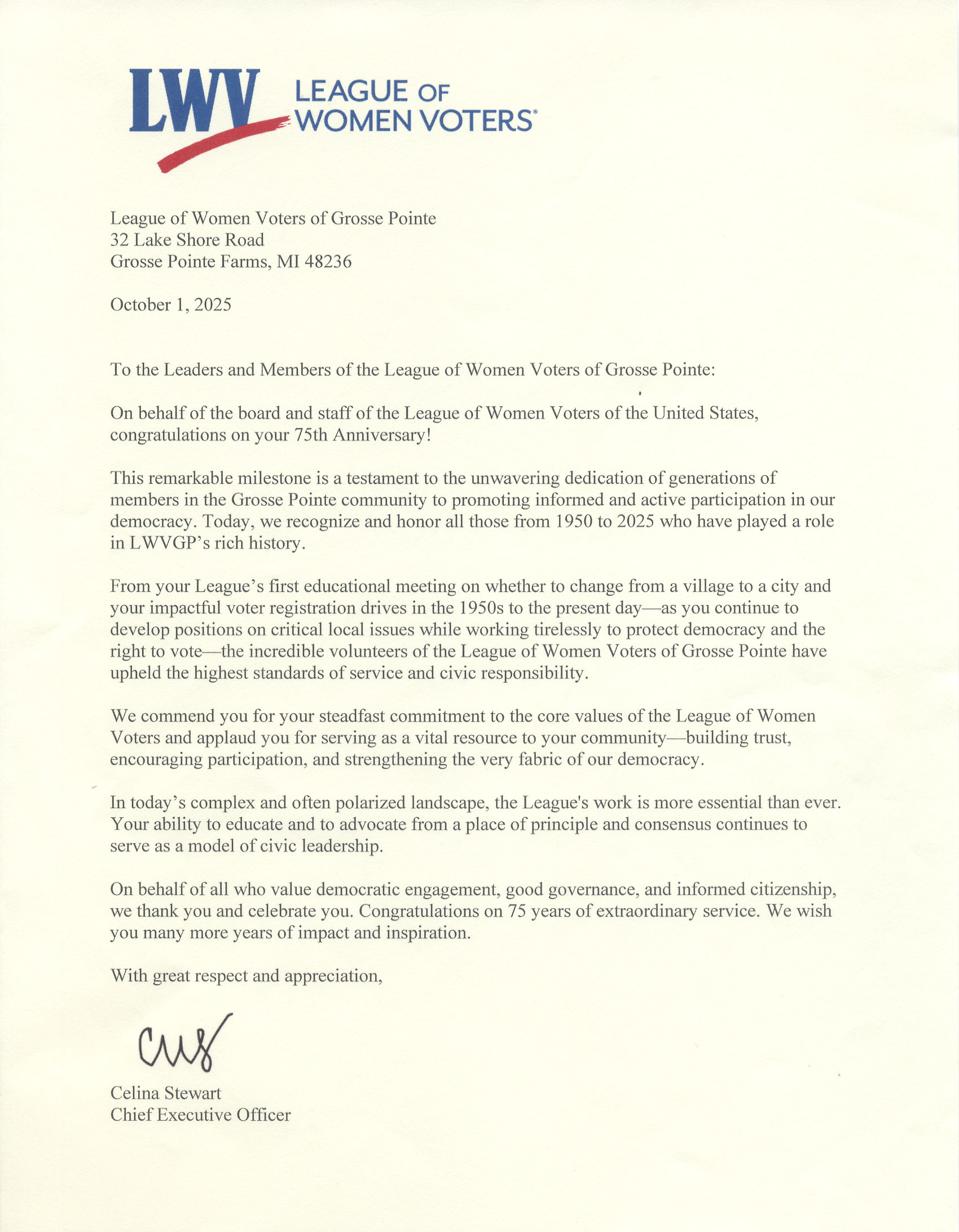 Letter of Congratulations LWVUS CEO Celina Stewart