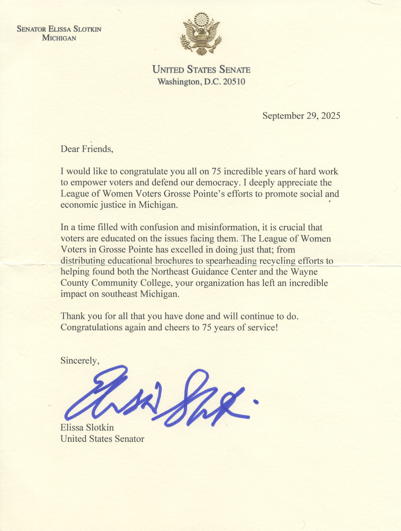 Letter of Congratulations Senator Elissa Slotkin
