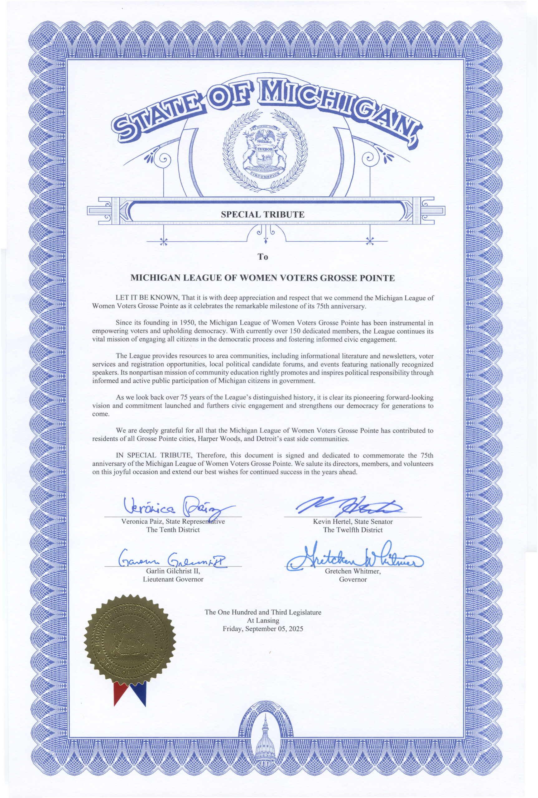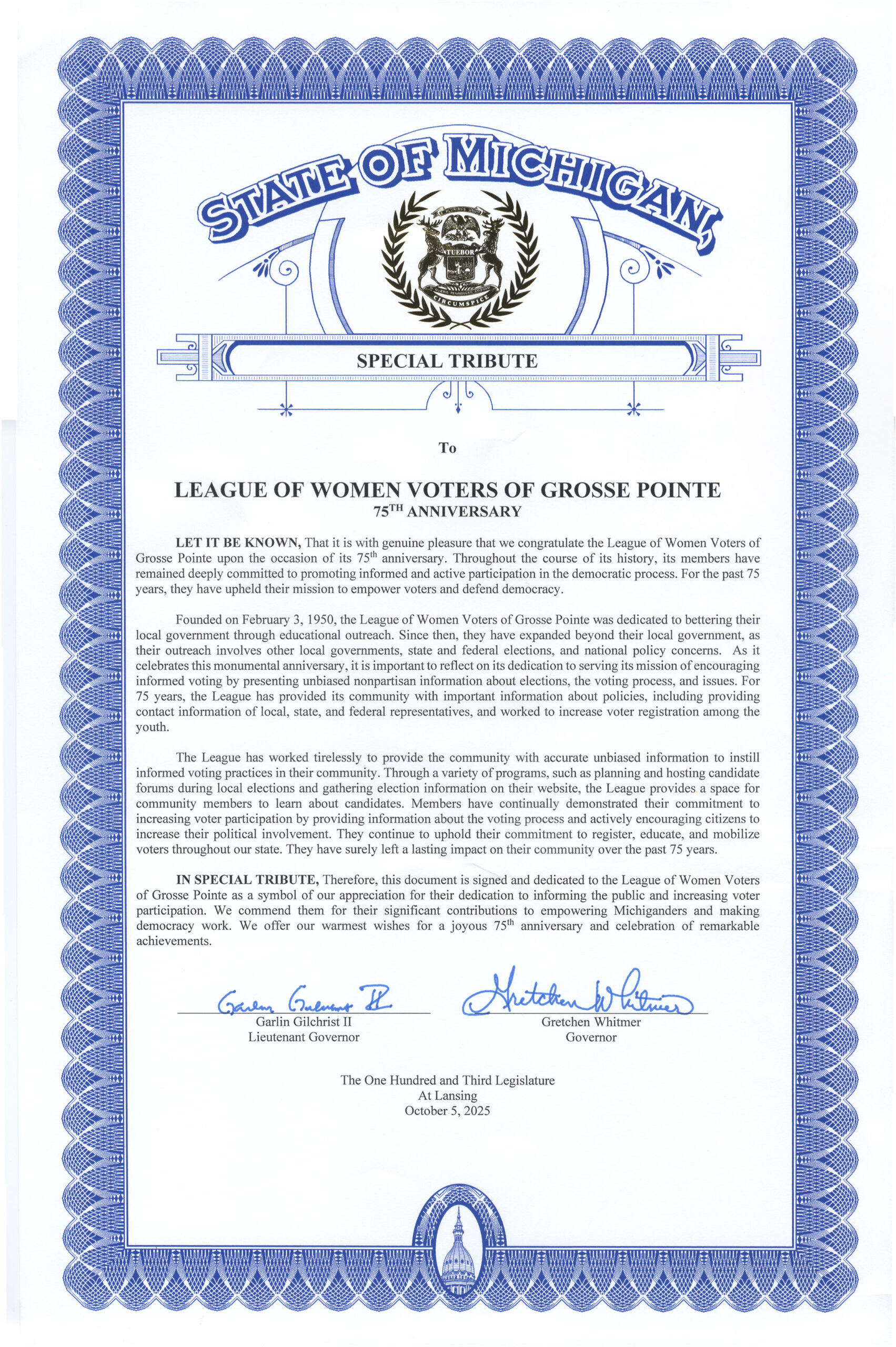 Letter of Congratulations LWVMI Co-Presidents Denise Hartsough and Lynne Kochmanski