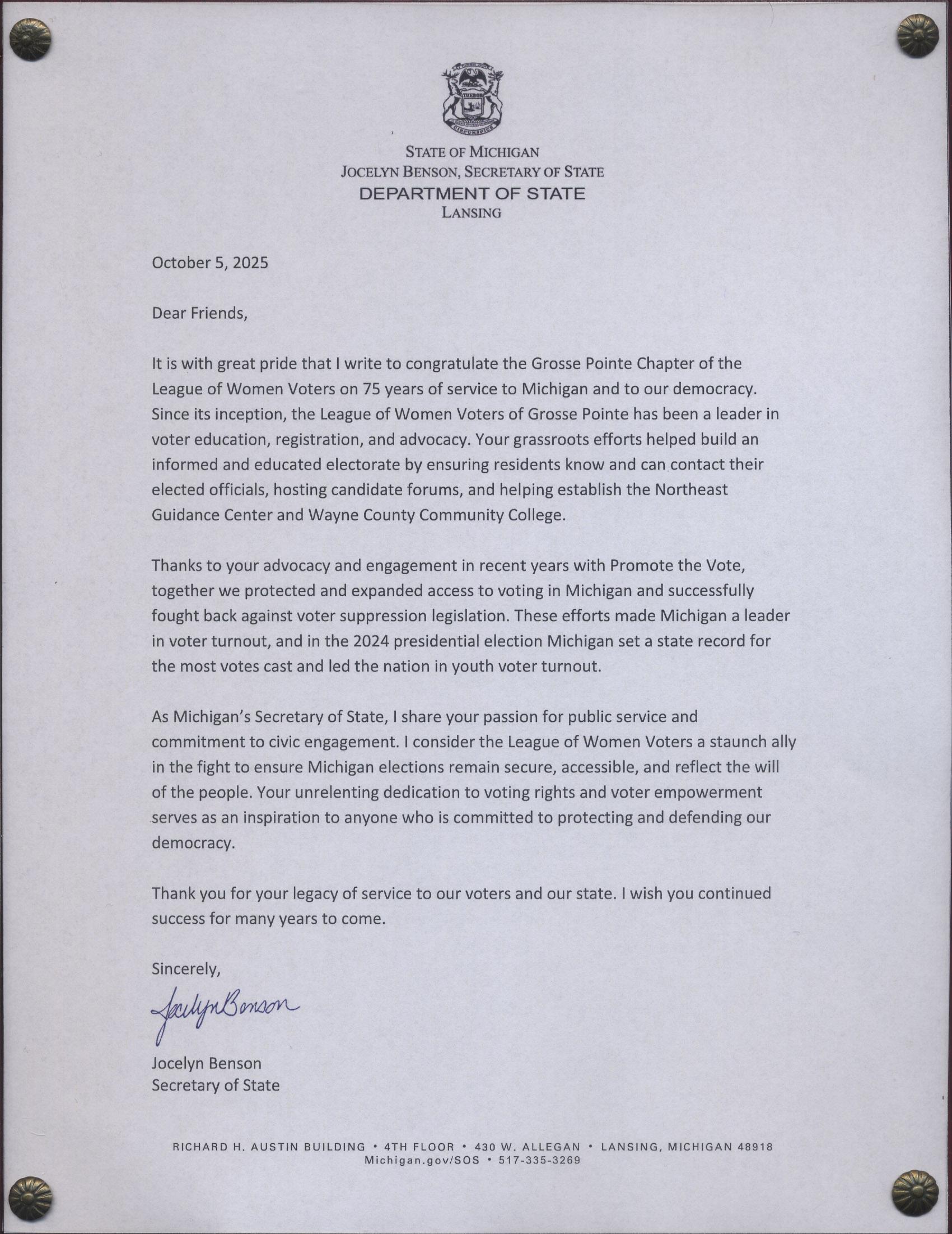 Letter of Congratulations Secretary of State Jocelyn Benson